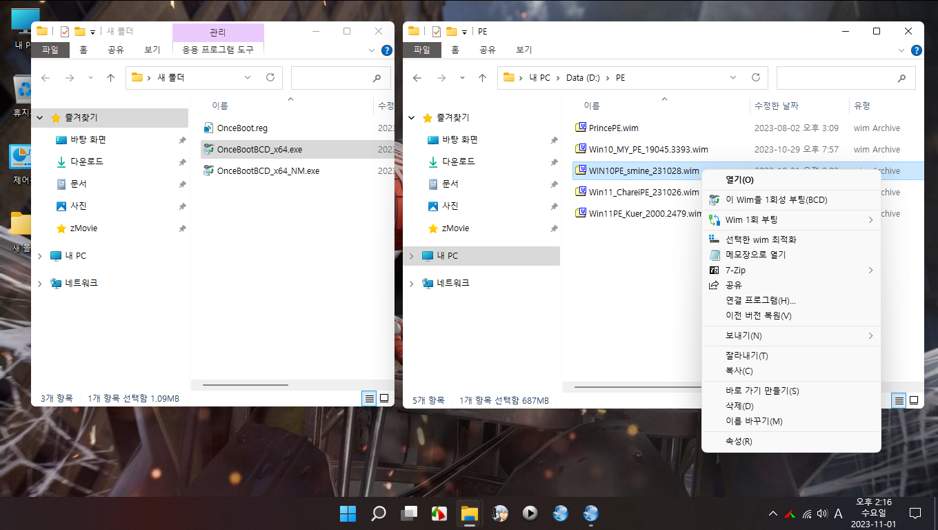 우클릭 1회성 wim 부팅의 경우 기존에는 TBWinPE.exe 프로그램을 우클릭에 등록해서 사용했는데 이번에는