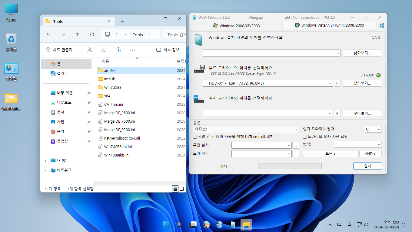 WinNTSetup 5.3.5.2 프로그램이 ARM64 비트 윈도우 설치를 지원하네요.