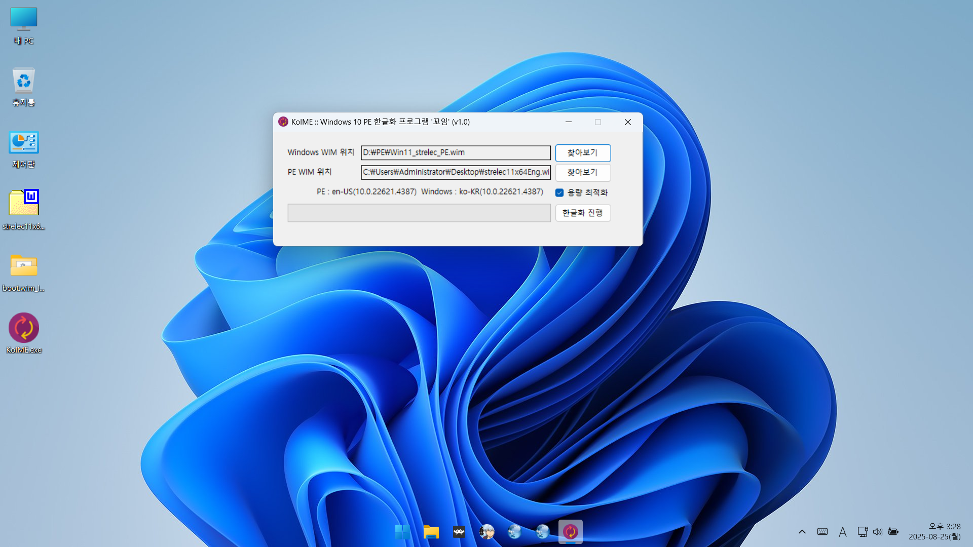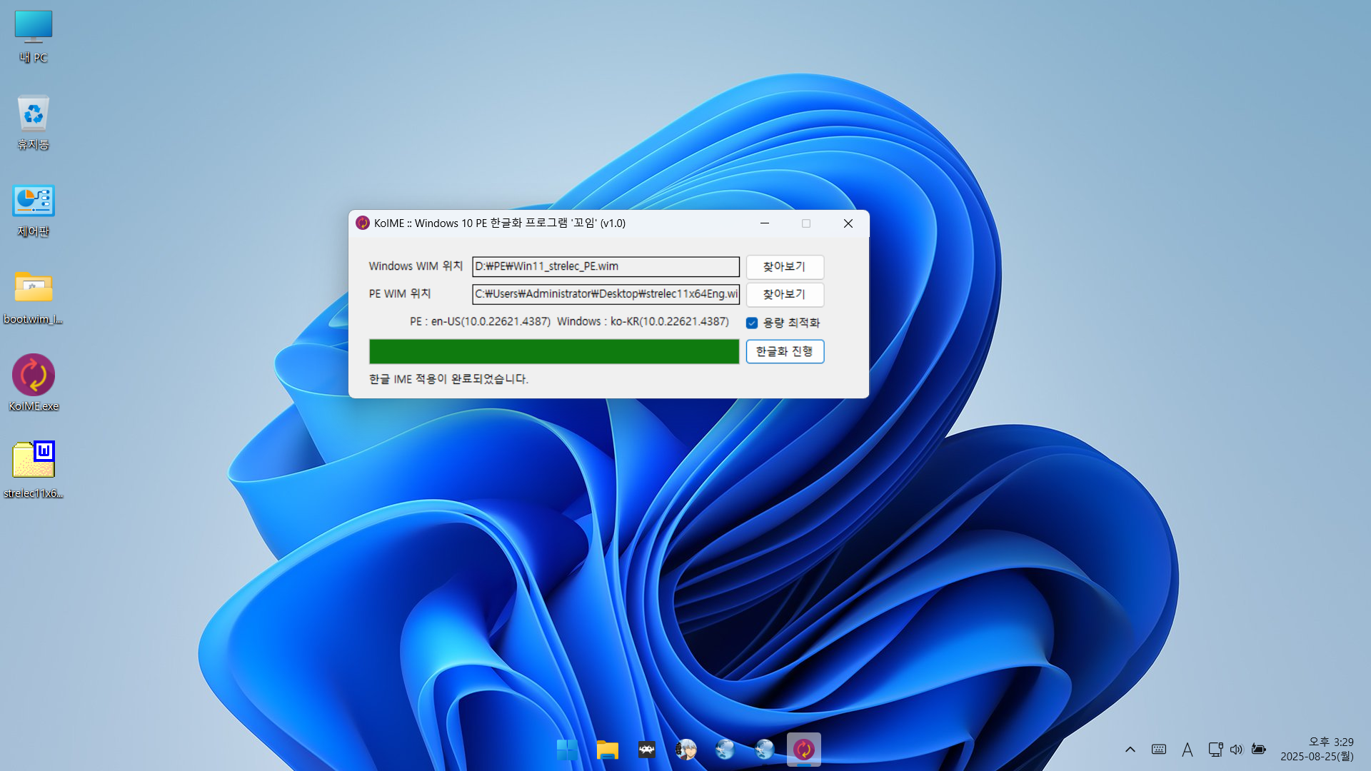 이때 한글화 된 세르게이 11pe wim 파일은 boot.wim_IME_Enable_Add-Driver.cmd