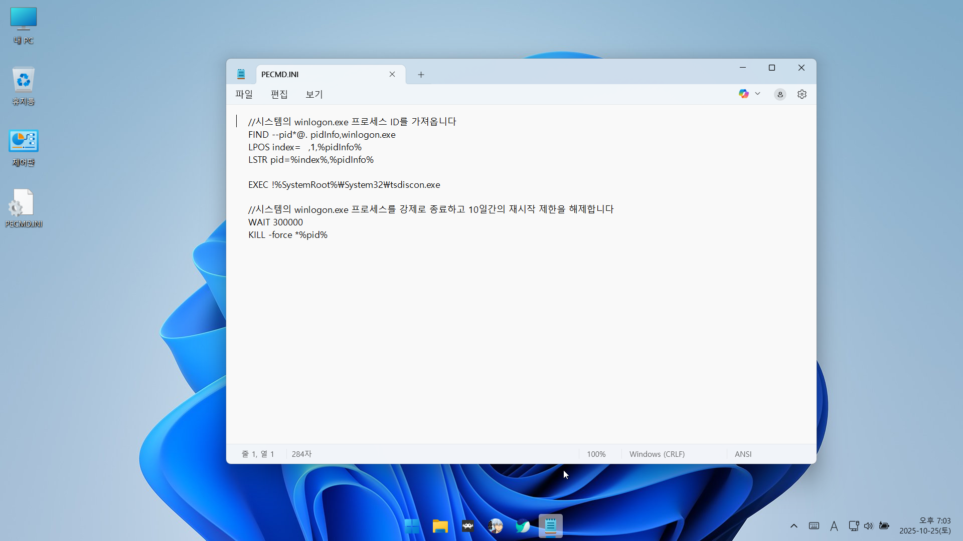 다되는 PE에 있는 pecmd.ini 명령어인데 pe 부팅 후 10일 있으면