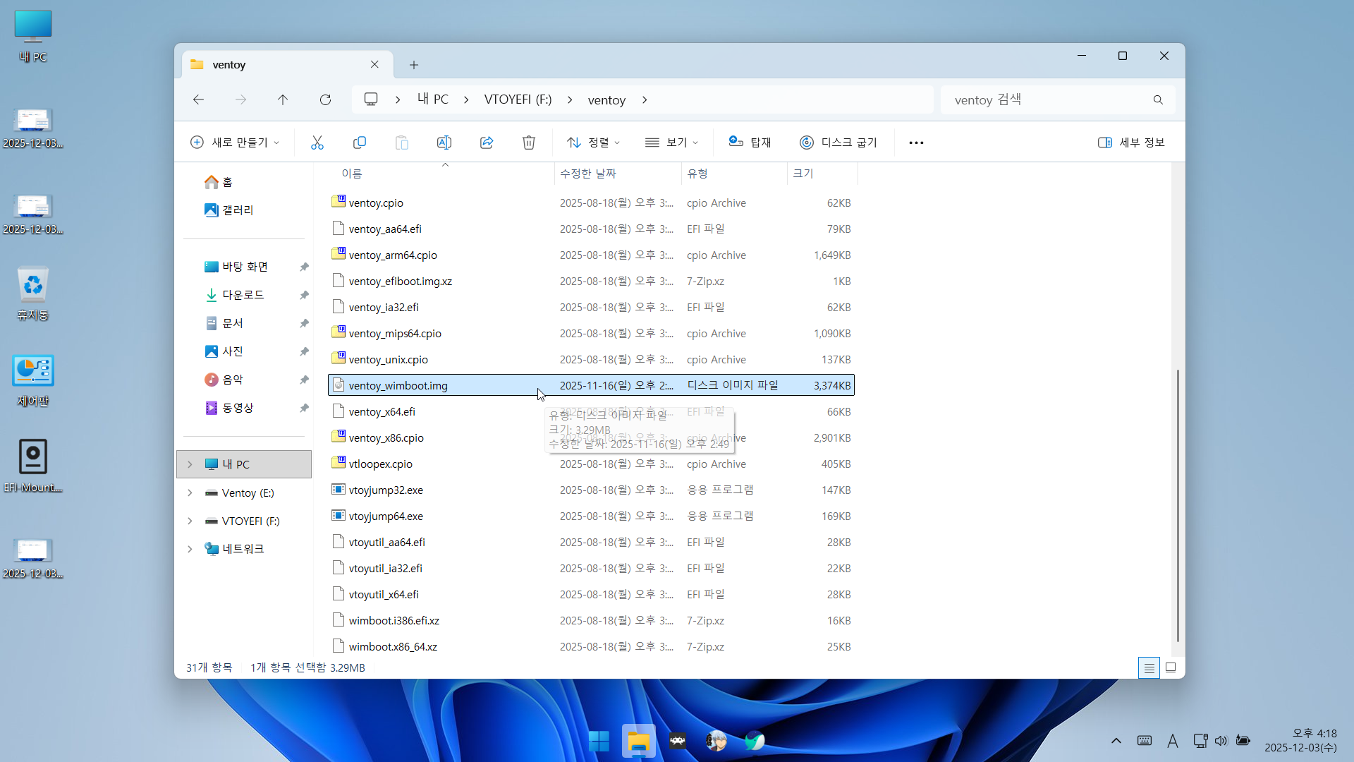 벤토이로 usb 부팅을 만든 후에 ventoy_wimboot.img 파일을 마지막 사진 처럼