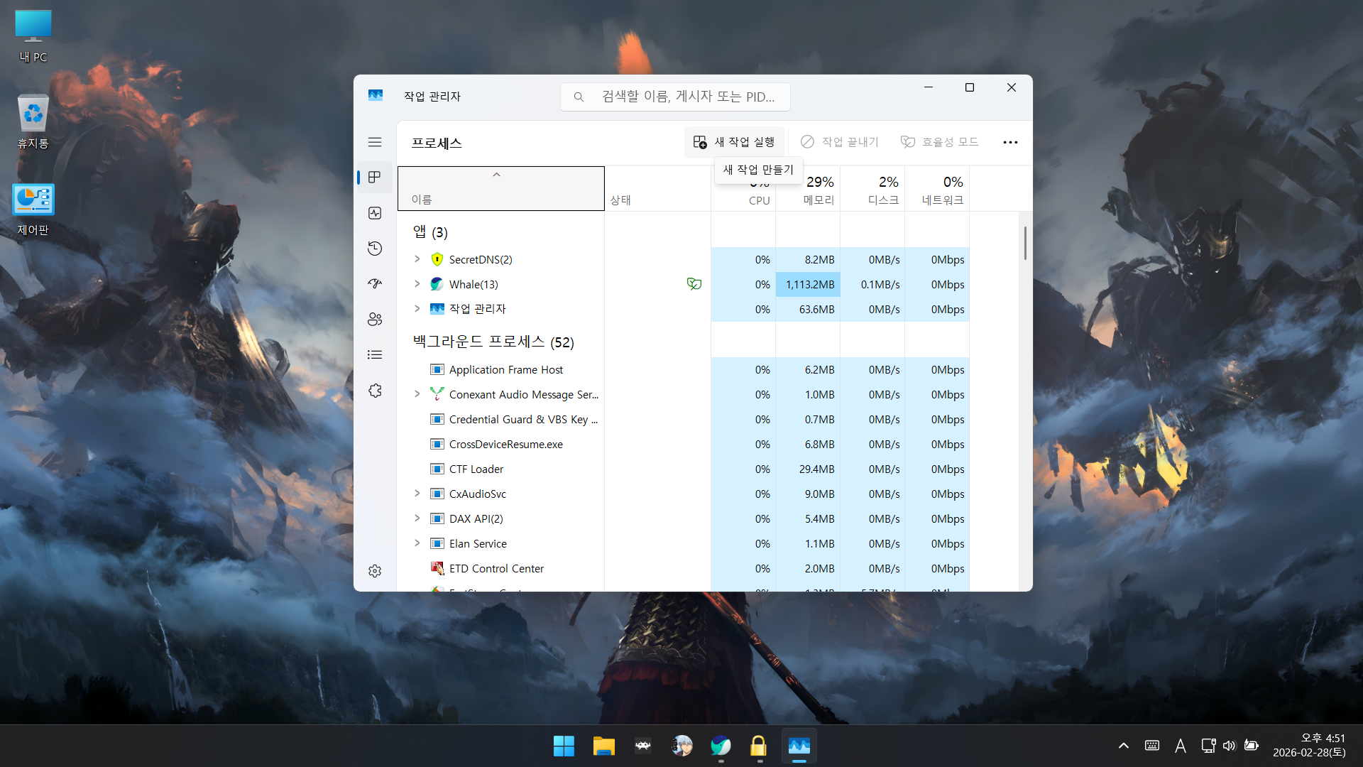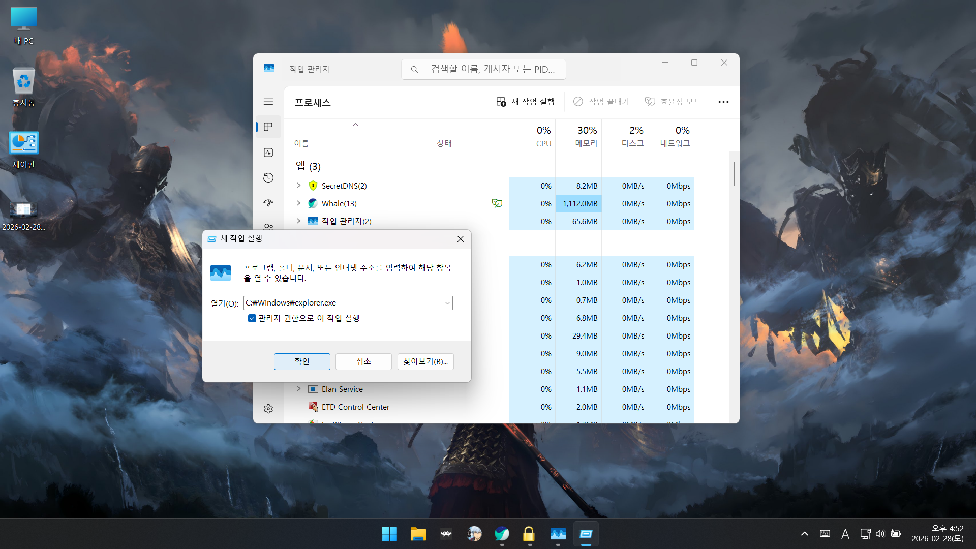 작업 관리자에서 새 작업 실행 후 탐색기를 윈도우 폴더에서 찾아서